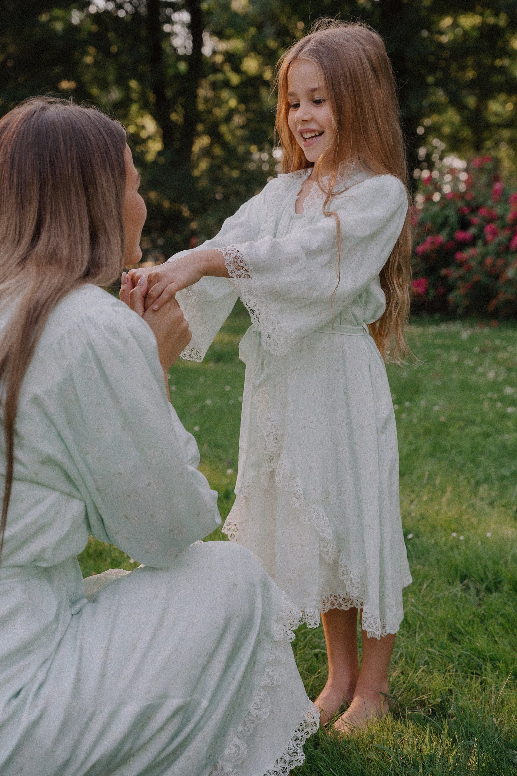Soft and romantic, the women’s lace-trimmed robe Sofia embodies quiet elegance and natural ease. Made from lightweight, breathable fabric with delicate lace detailing, this robe drapes effortlessly over the body for a graceful silhouette. Designed with a flattering wrap shape, adjustable waist tie, and gently flared sleeves, it offers both comfort and refinement. Intricate lace accents along the neckline, cuffs, and hem add a subtle vintage touch, making it perfect for slow mornings, peaceful evenings, or special moments at home.
