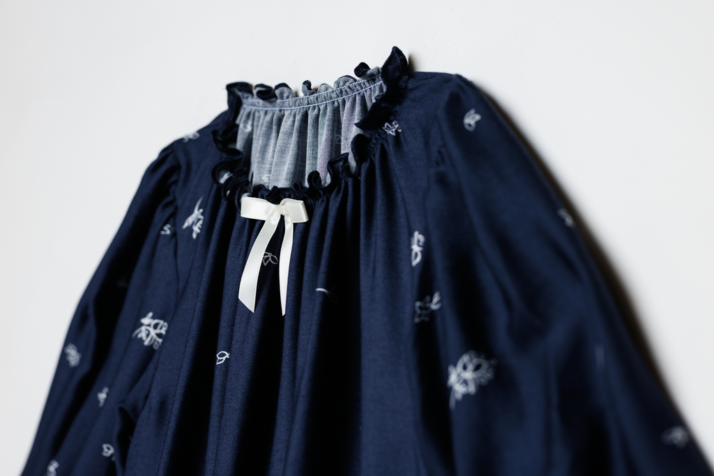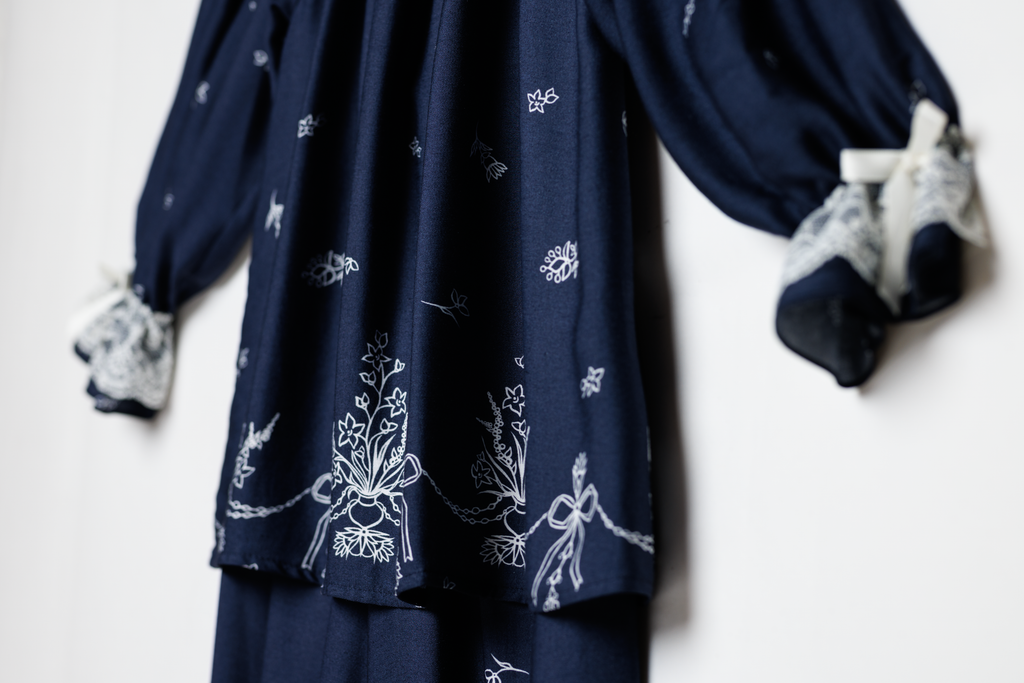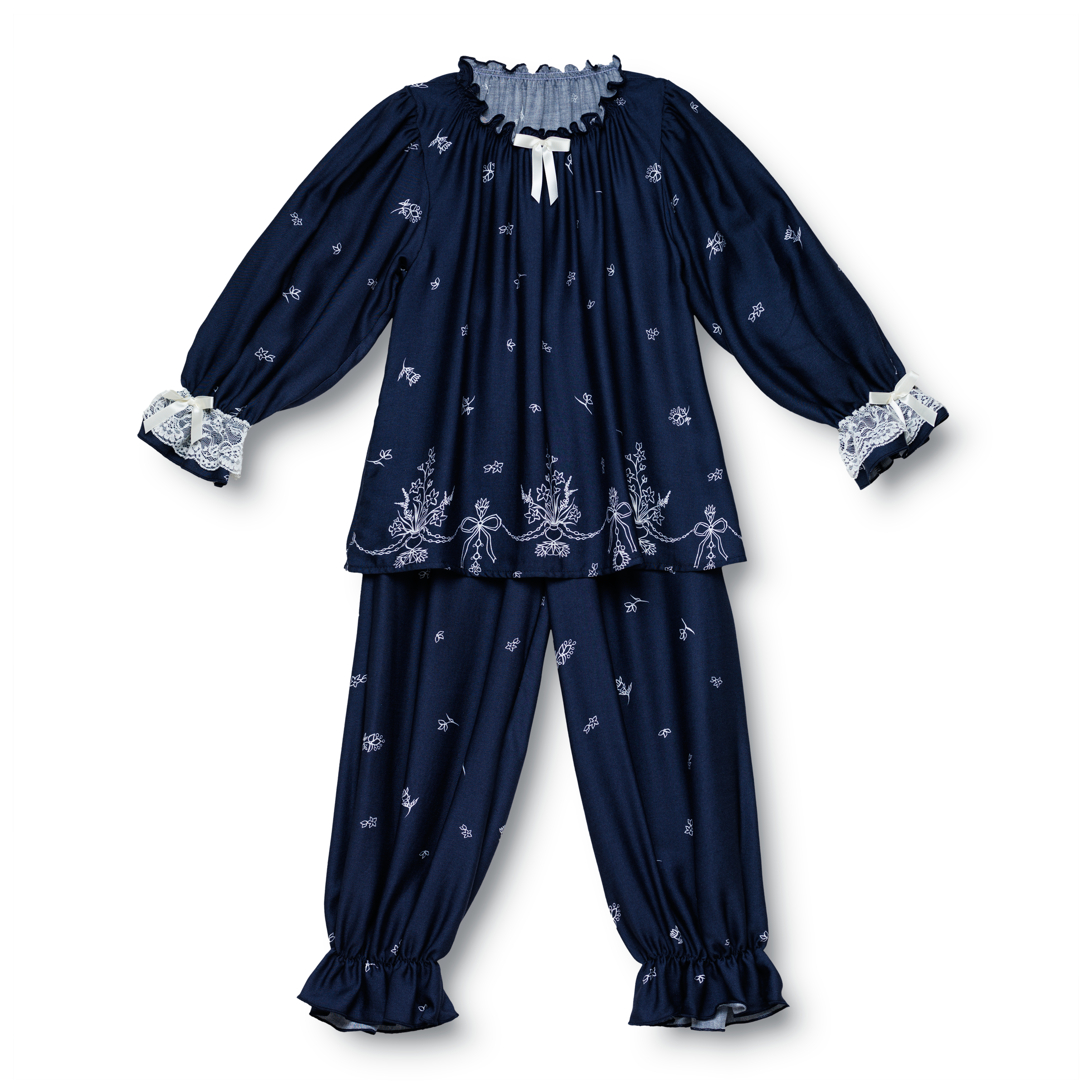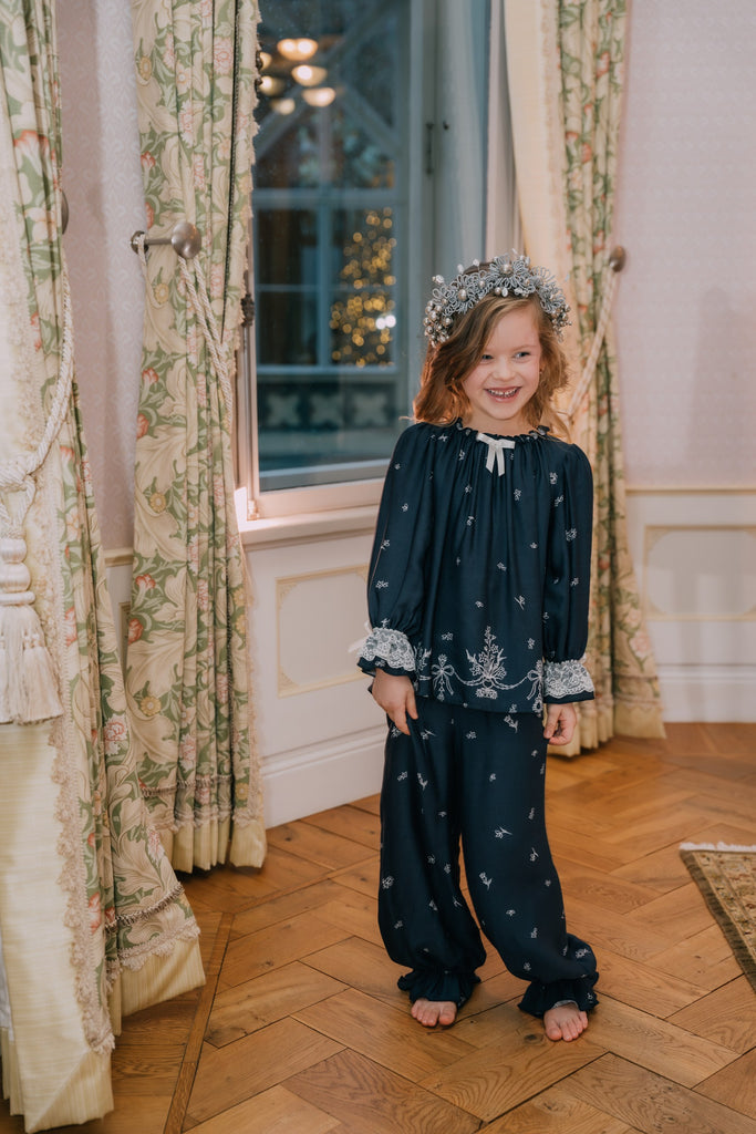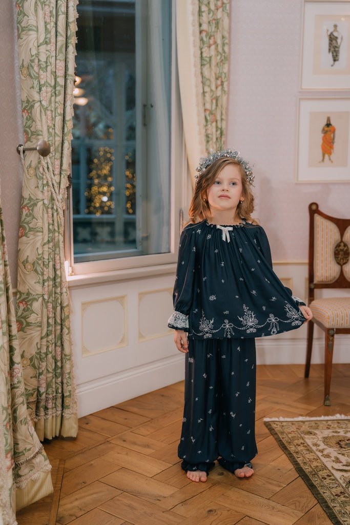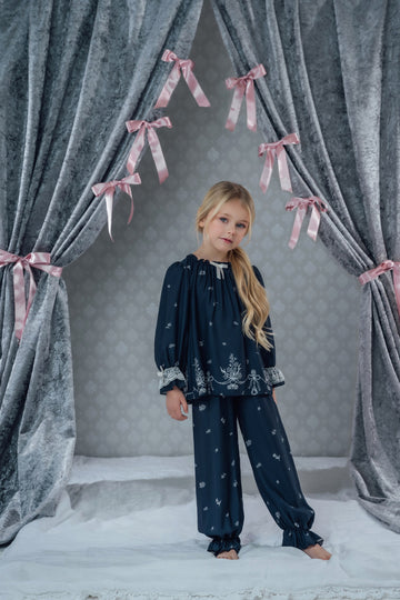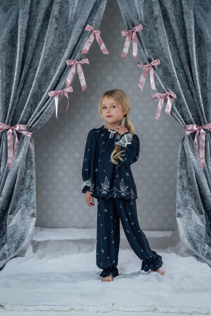 Victorian style kids pyjama set Grace has truly beautiful design. This navy colored set is made of soft viscose.